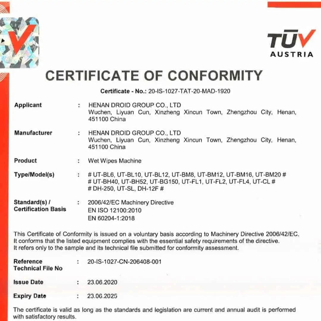 Each DROID wet wipes machine has received CE certification from a recognized EU Notified Body, ensuring compliance with the highest international standards for risk management and operational safety.